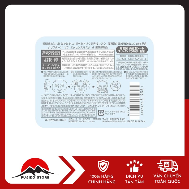 Hộp mặt nạ 30 miếng bổ sung vitamin C làm sáng mịn da KOSE là dòng mặt nạ làm bằng giấy được ngâm trong tinh chất chứa vitamin C dồi dào, hoàn toàn không có hương liệu và màu hóa học, giúp da trở nên mềm mại và tăng độ đàn hồi cho da, đồng thời bổ sung dưỡng chất cần thiết cho làn da sau ngày dài. Với chiết xuất 12 loại thảo dược thiên nhiên, giúp tinh chất ngấm sâu vào da, phục hồi các tổn thương trên da, làm mờ và hạn chế các nếp nhăn, giúp nâng cơ mặt, nhanh chóng tái tạo làn da mới, căng mịn và trắng sáng hơn.