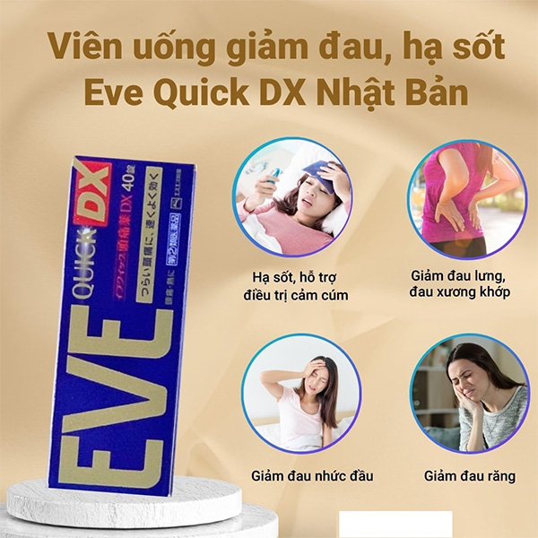 – Thuốc uống giảm đau hạ sốt EVE QUICK DX không chỉ hỗ trợ trị cảm cúm, mà nó còn có hiệu quả trên mọi chỗ đau trên cơ thể.